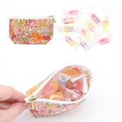 てのひらサイズですがマチ付きなので小さな化粧品で4-5個、飴なら10個ほど入る大きさです。