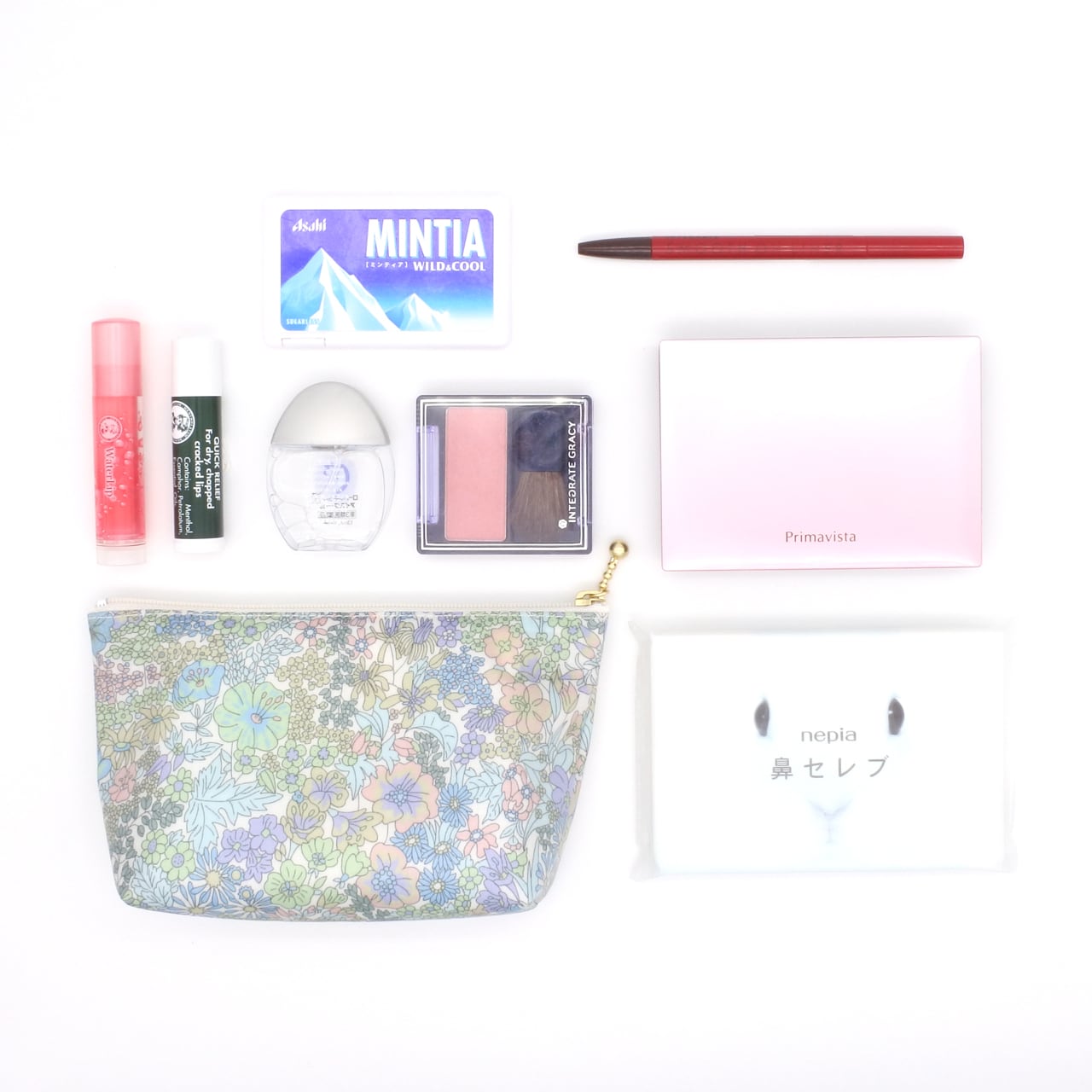 パクト2-3個、リップ、ペンシル類、ポケットティッシュなどが入る中くらいのサイズです。