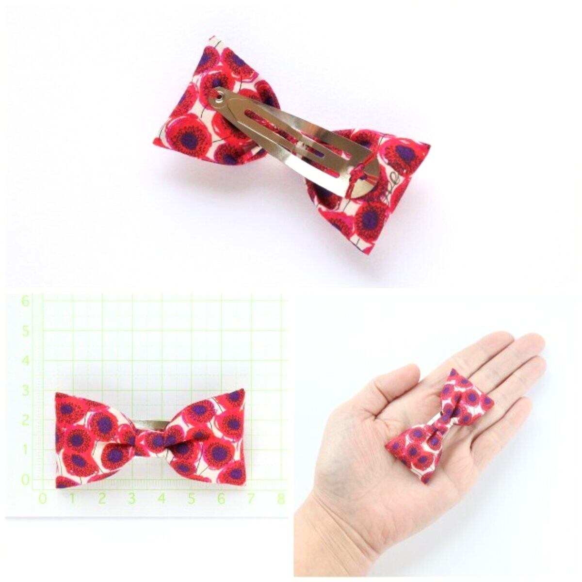 リバティ ザンジーサンビーム(Xanthe Sunbeam)のタナローン生地を使用した、ぷっくりしたリボンが愛らしいヘアピン(スリーピン パッチンピン パッチンどめ パッチン留め)です。